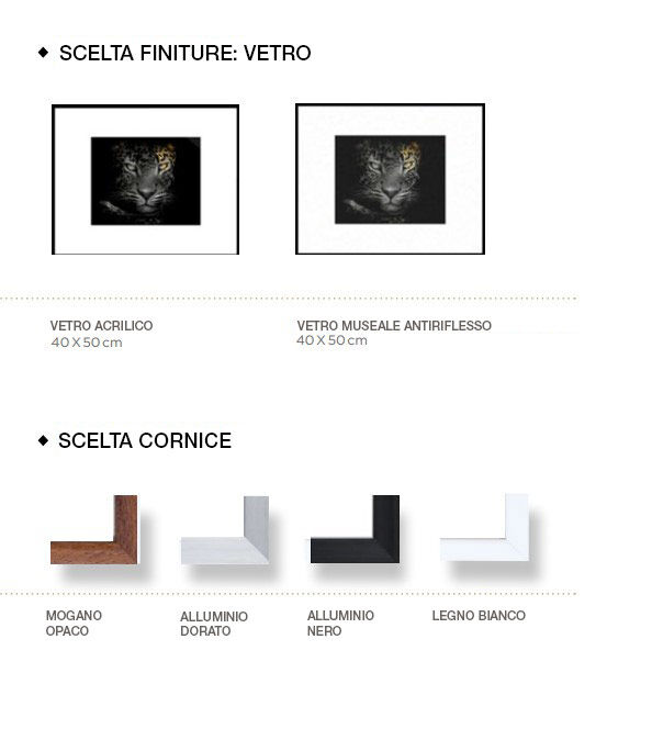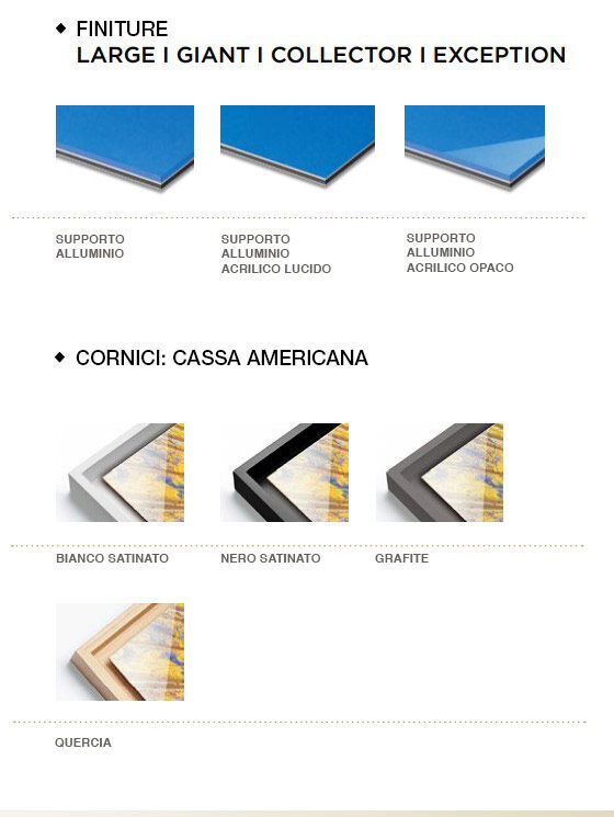 Sotto la supervisione dell'artista, le stampe sono numerate ed accompagnate da un certificato di autenticità. In accordo con il fotografo, la stessa fotografia può essere disponibile in uno o più formati: (20x25 cm, 40x50 cm, 50x70 cm, 60x90 cm, 100x150 cm, 120x180 cm e 150x225 cm). Ogni formato corrisponde a una limitazione particolare (ogni stampa è in un'edizione limitata e numerata di 50, 200, 300, 500, 2000 o 5000 copie).